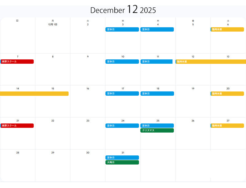 ※誠に勝手ながら、12月の土曜日は、臨時休業とさせていただきます。