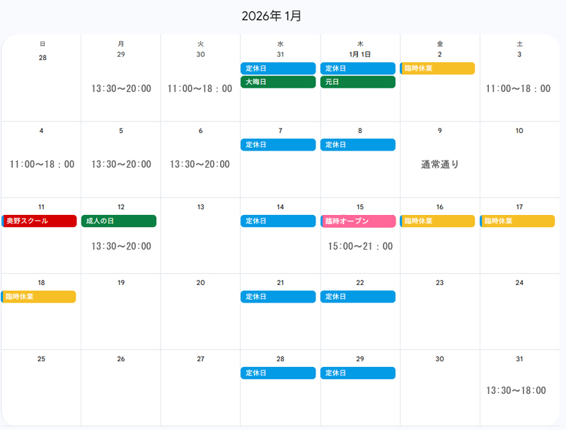 ただし、下記日程は営業時間・臨時休業・臨時オープン等ございます。